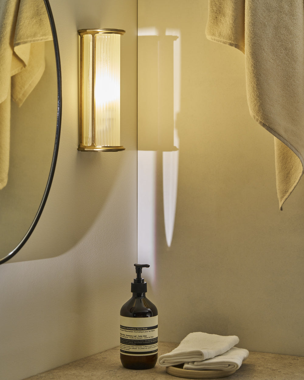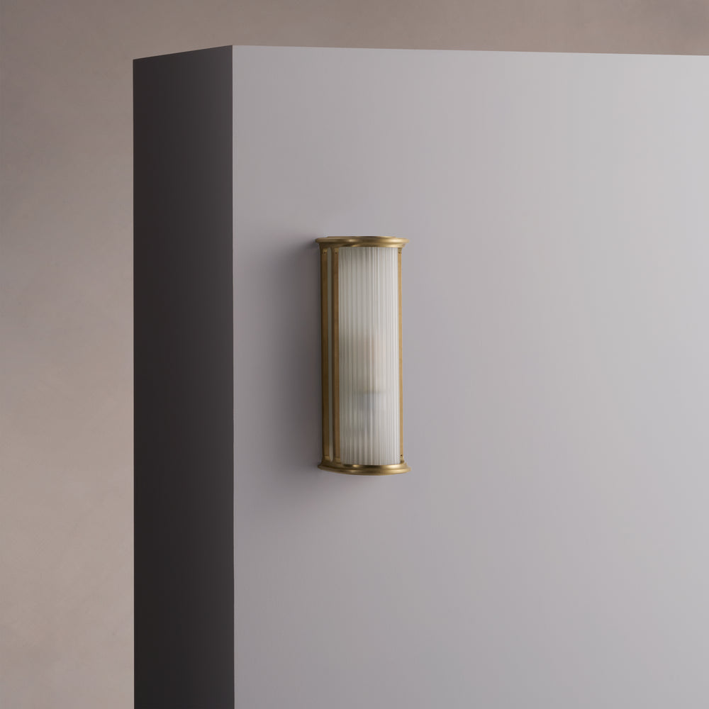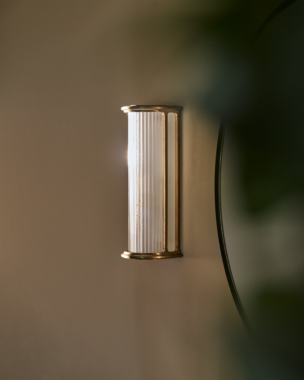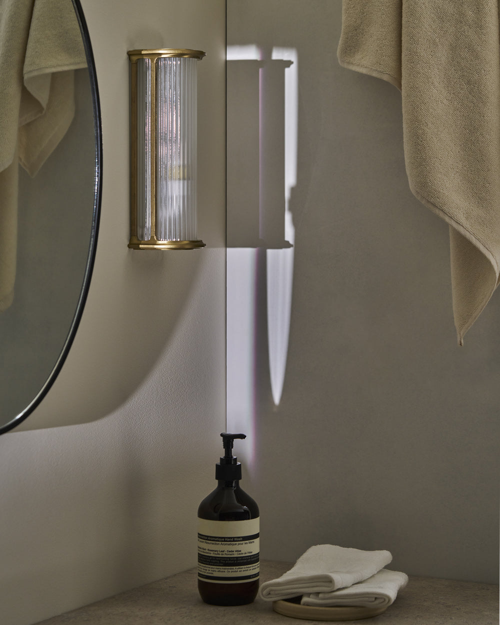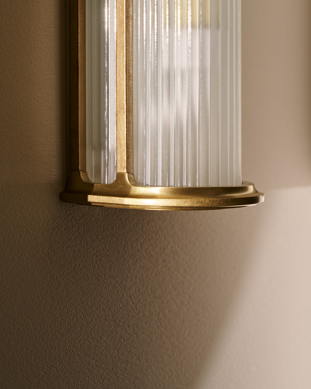 Bank je naše verze krabicového svítidla s robustním rámem z masivní mosazi, který drží stínidlo z matného drážkovaného skla. Vnitřní části jsou práškově lakované bílou barvou, takže vypadá skvěle, ať už je zapnuté, nebo vypnuté.