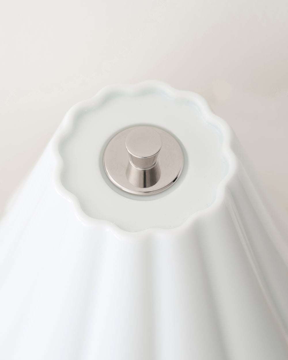 Jemně zvlněné stínidlo z jemného porcelánu poskytuje teplé, atmosférické světlo bez jakéhokoliv oslnění. Zvolili jsme velmi decentní vlnkování, které nikdy nevyjde z módy.