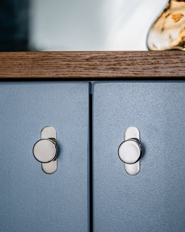 Wir haben unseren unverwechselbar modernen Schrankknauf Kilburn mit einer Blende entworfen, damit Schubladen und Schranktüren vor Kratzern und Abnutzung geschützt sind.
