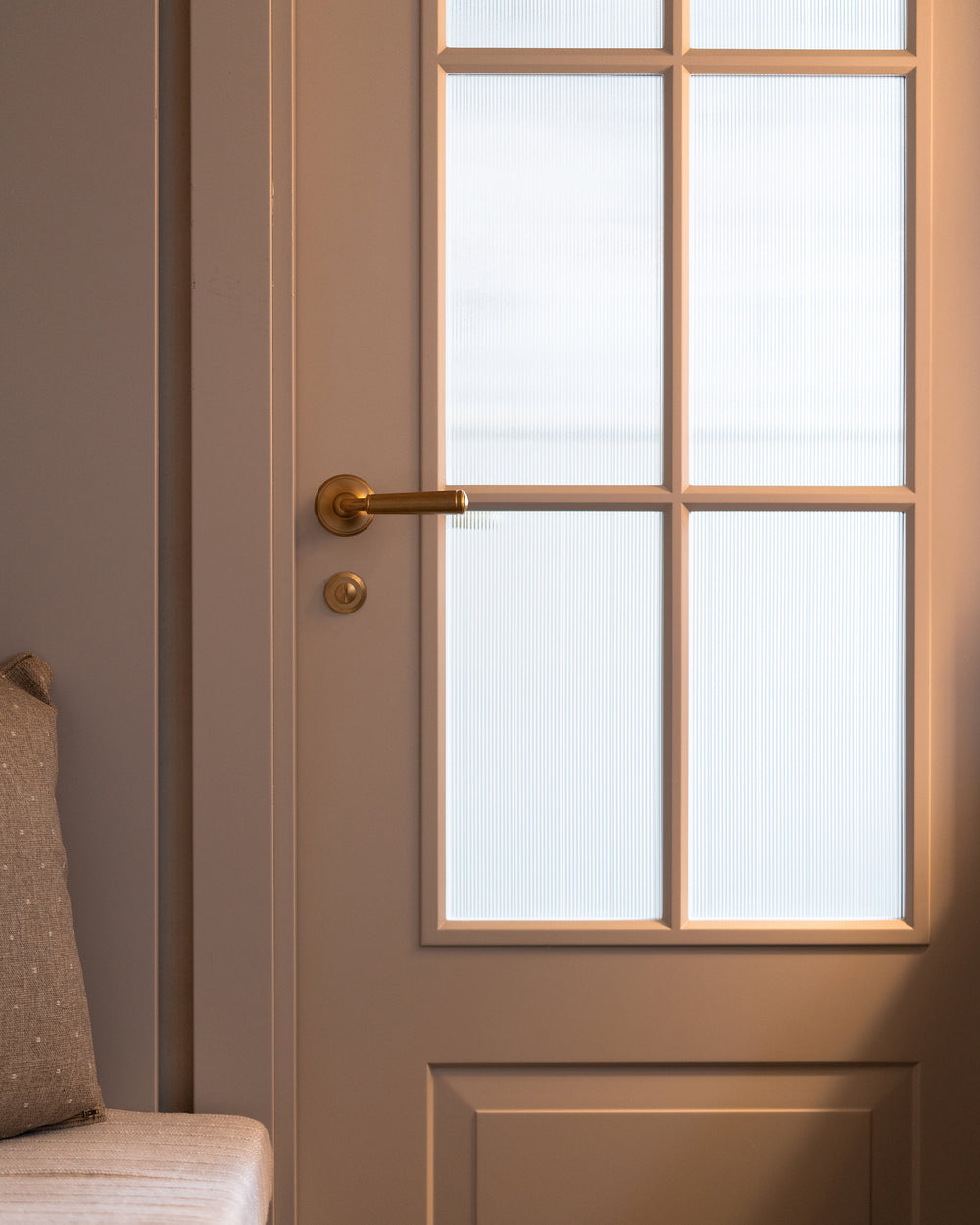 Im Inneren befindet sich ein Federmechanismus, der stark genug ist, um das Gewicht des Griffs aus Massivmessing zu tragen. Er verhindert zudem, dass sich dieser mit der Zeit lockert. Der Griff eignet sich auch für Schlösser ohne Feder, da er selbst gefedert ist.
