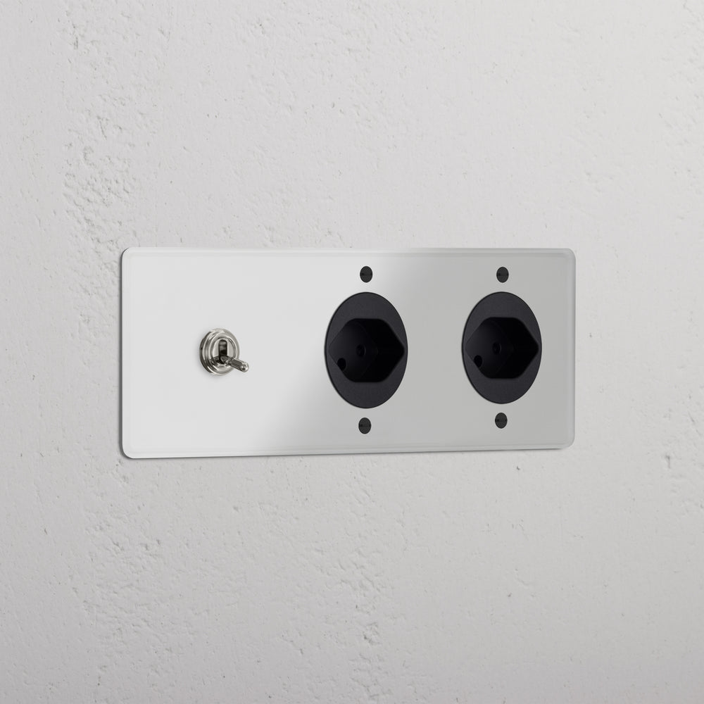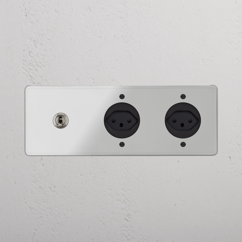 Dieser Dreifachrahmen kombiniert einen Wechselkipphebelschalter und zwei Typ-J-Steckdosen.