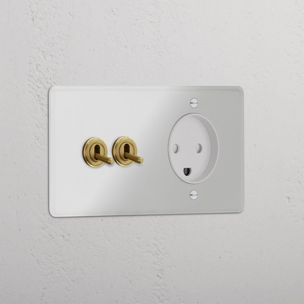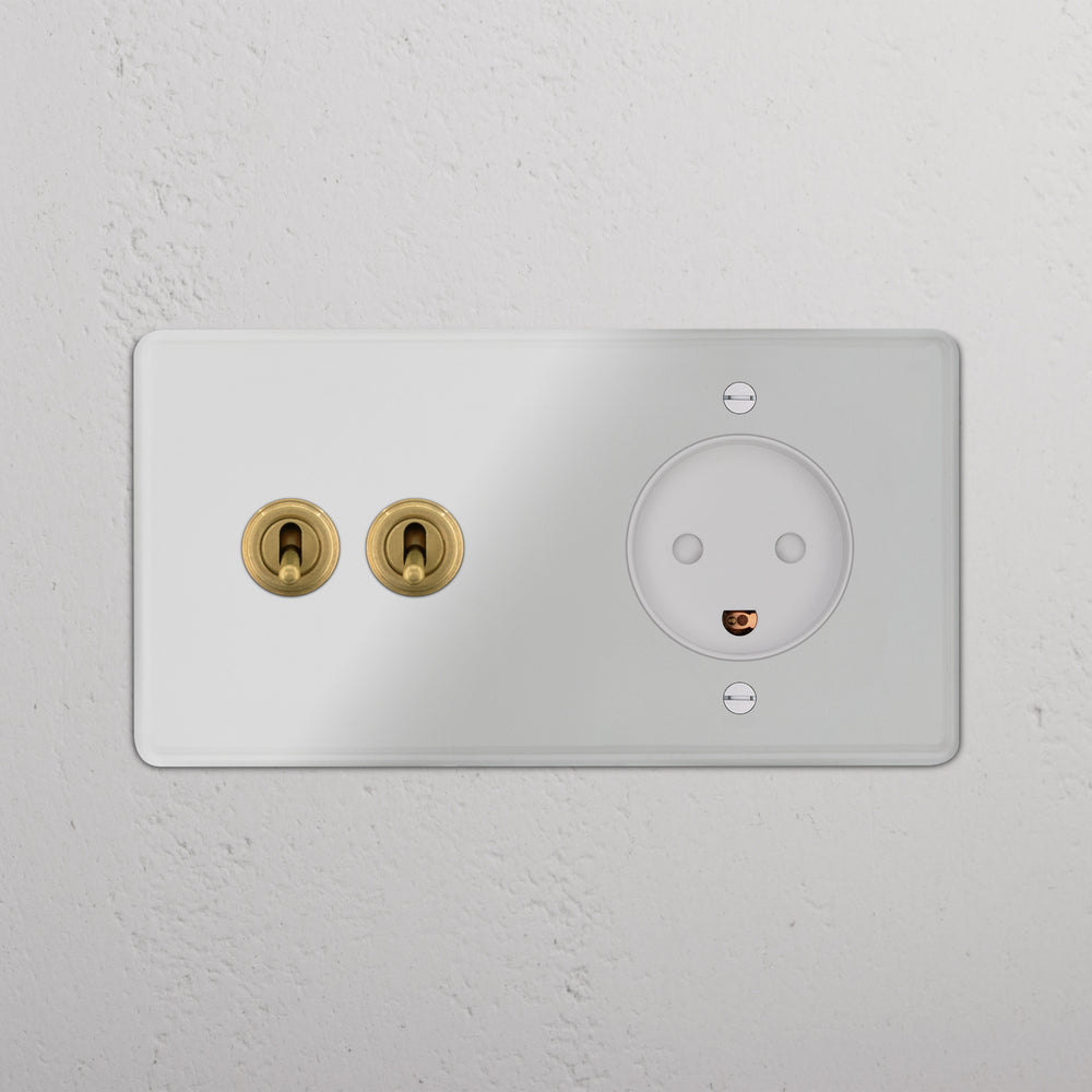 Diese Doppelsteckdose kombiniert zwei Wechselkipphebelschalter und eine dänische Steckdose in einem Rahmen.