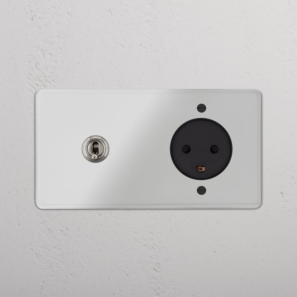 Dieser Doppelrahmen kombiniert einen Wechselkipphebelschalter und eine Typ-K-Steckdose.