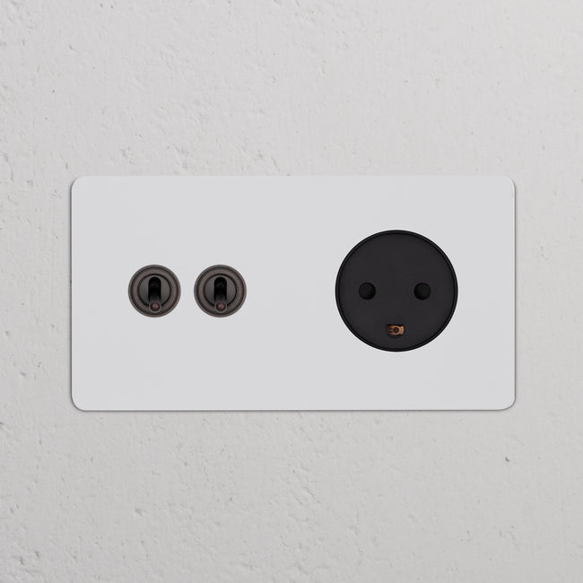 This double mixed switch and socket combines two two-way toggle switches and a Danish socket on one plate.