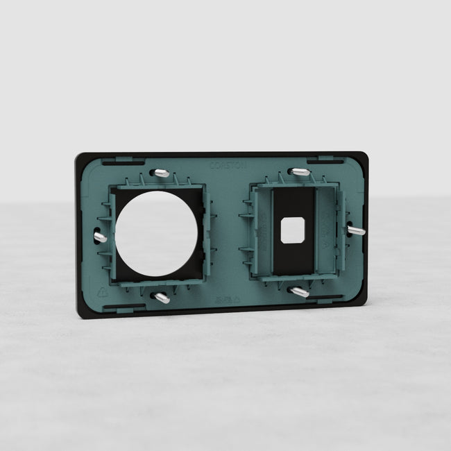 This Grove double 1x switch and 1x socket plate in bronze works with any one of our bronze toggle or rotary dimmer switches and any one of our round socket modules (just make sure you choose the ones made with black plastic).