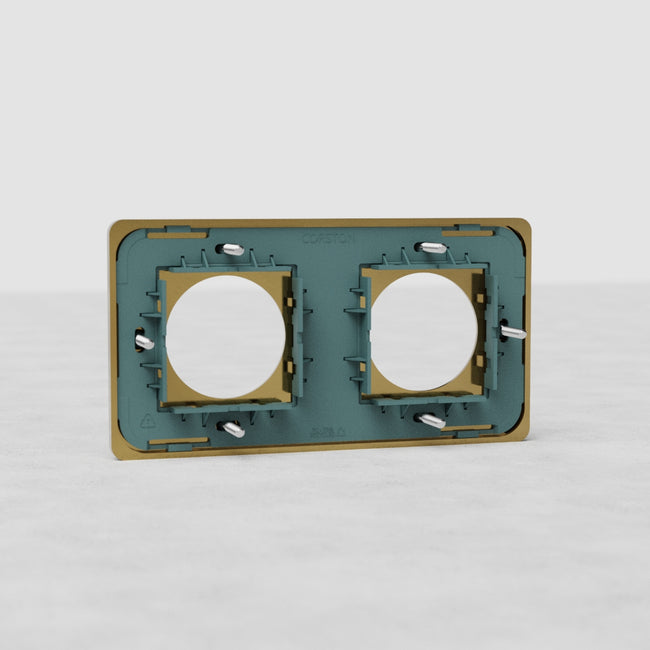 This Grove double socket plate in antique brass works with any two of our round socket modules.