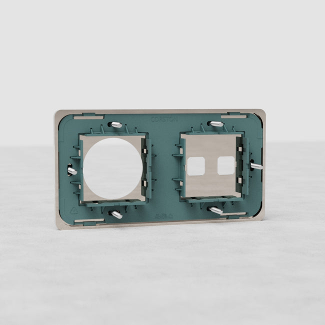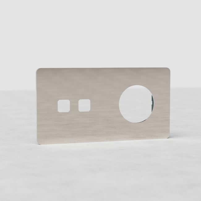 This Grove double 2x switch and 1x socket plate in polished nickel works with any two of our polished nickel toggle switches and any one of our round socket modules.