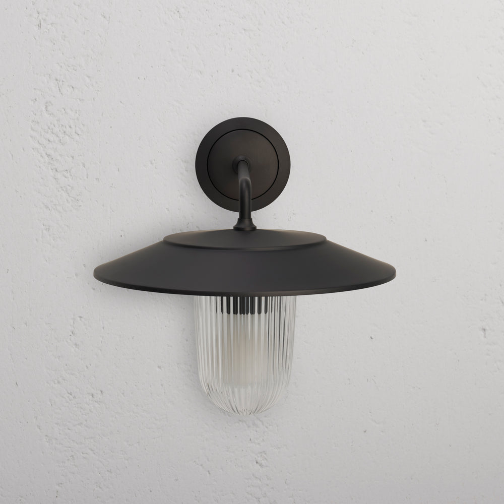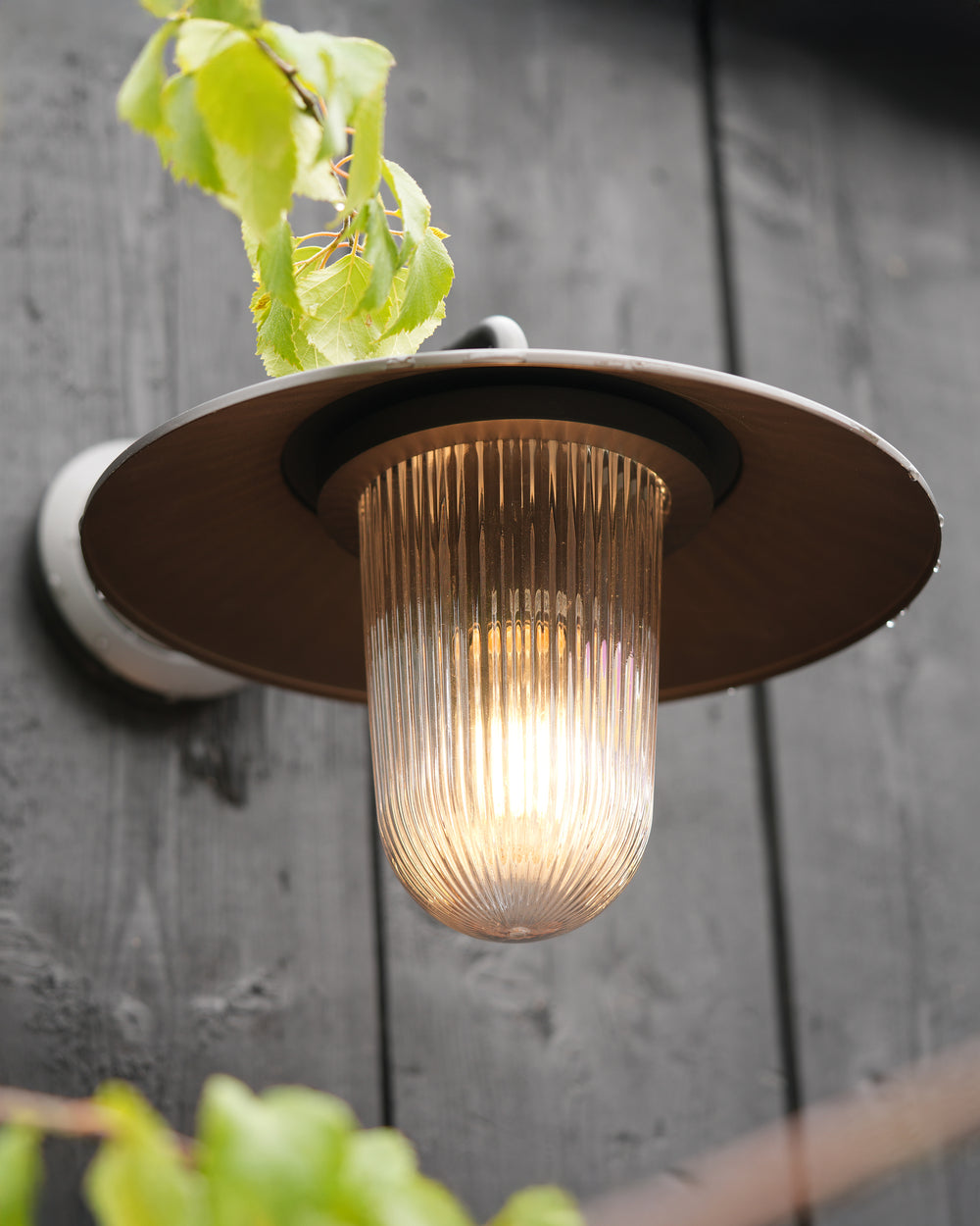 Our Kensington wall light has a large solid brass ‘cap’ to protect it from rain. The fluted glass cover provides 360-degree diffused lighting thanks to the vertical grooves.