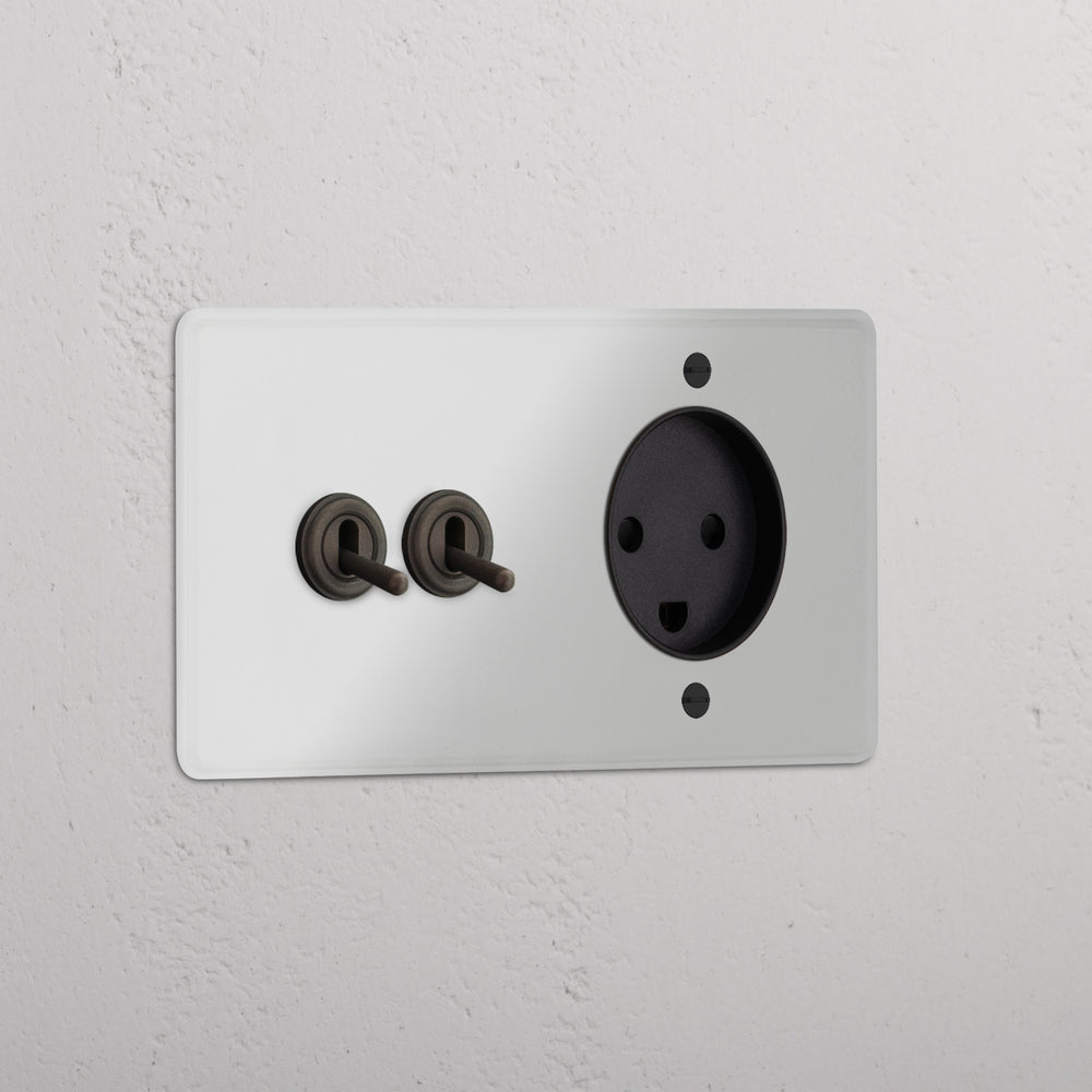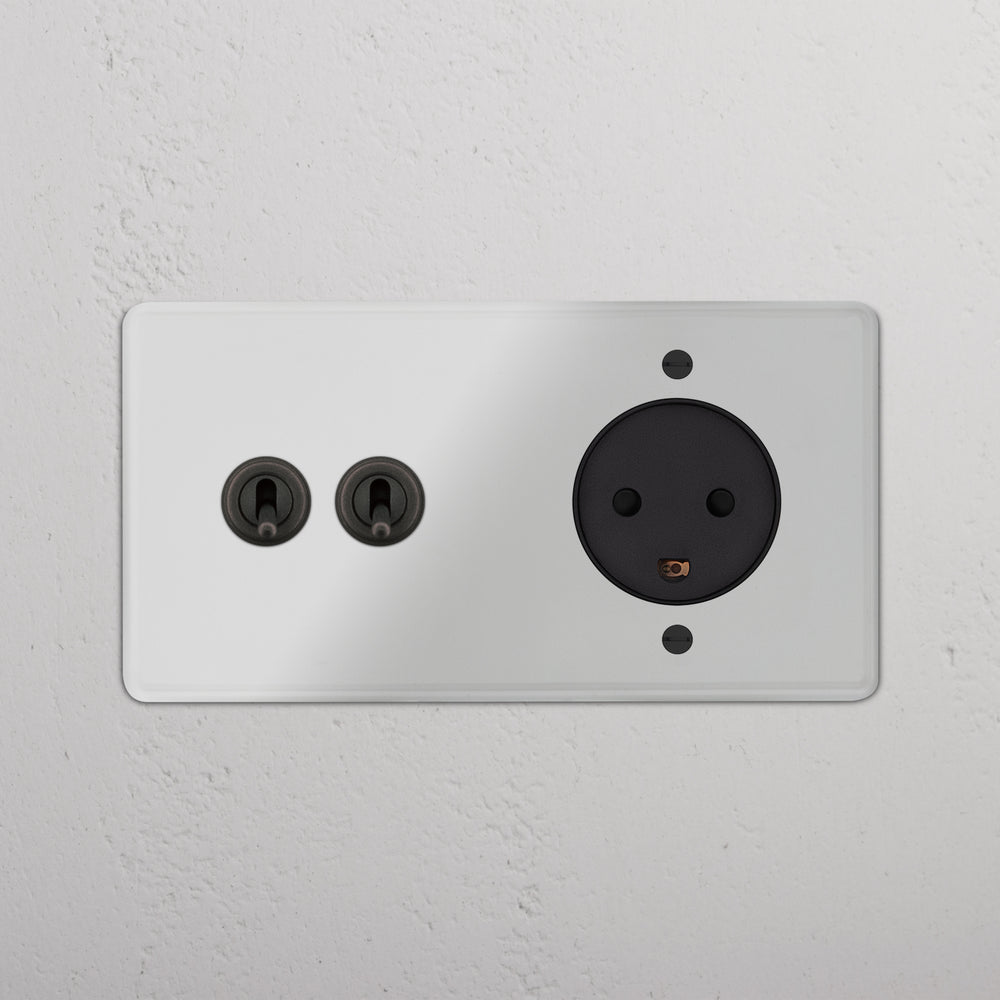 This double mixed switch and socket combines two two-way toggle switches and a Danish socket on one plate.