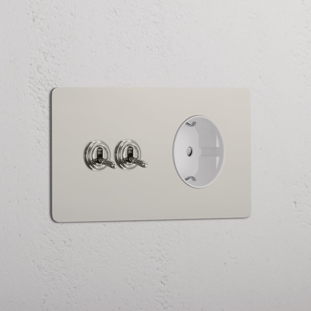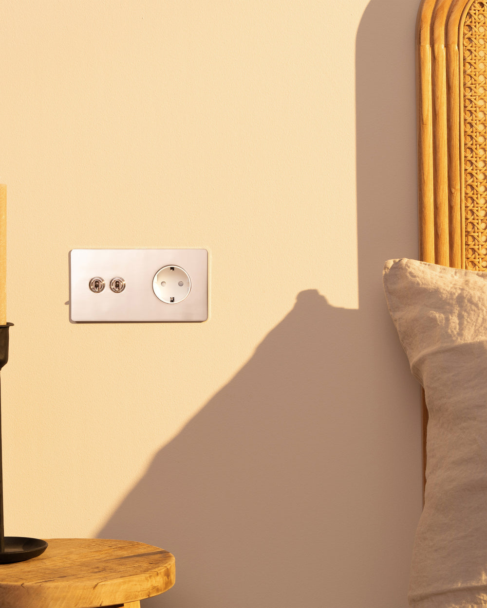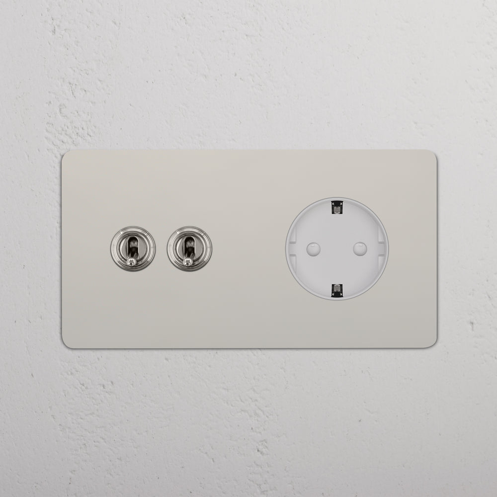 This double mixed switch and socket combines two two-way toggle switches and a Schuko socket on one plate.