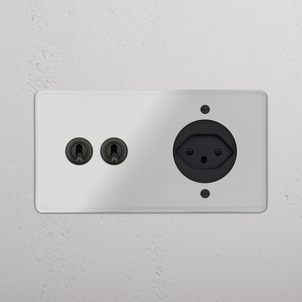This double mixed switch and socket combines two two-way toggle switches and a Swiss socket on one plate.