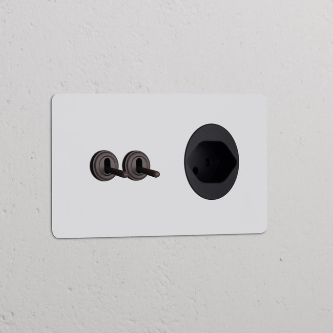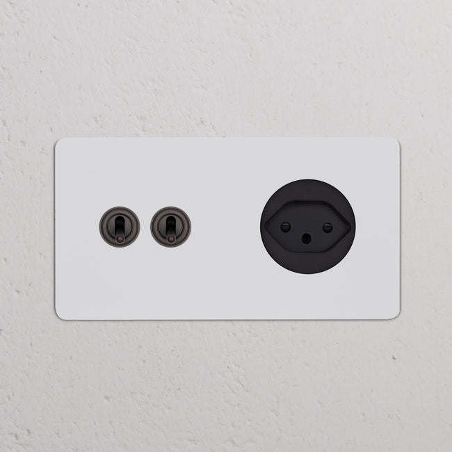 This double mixed switch and socket combines two two-way toggle switches and a Swiss socket on one plate.