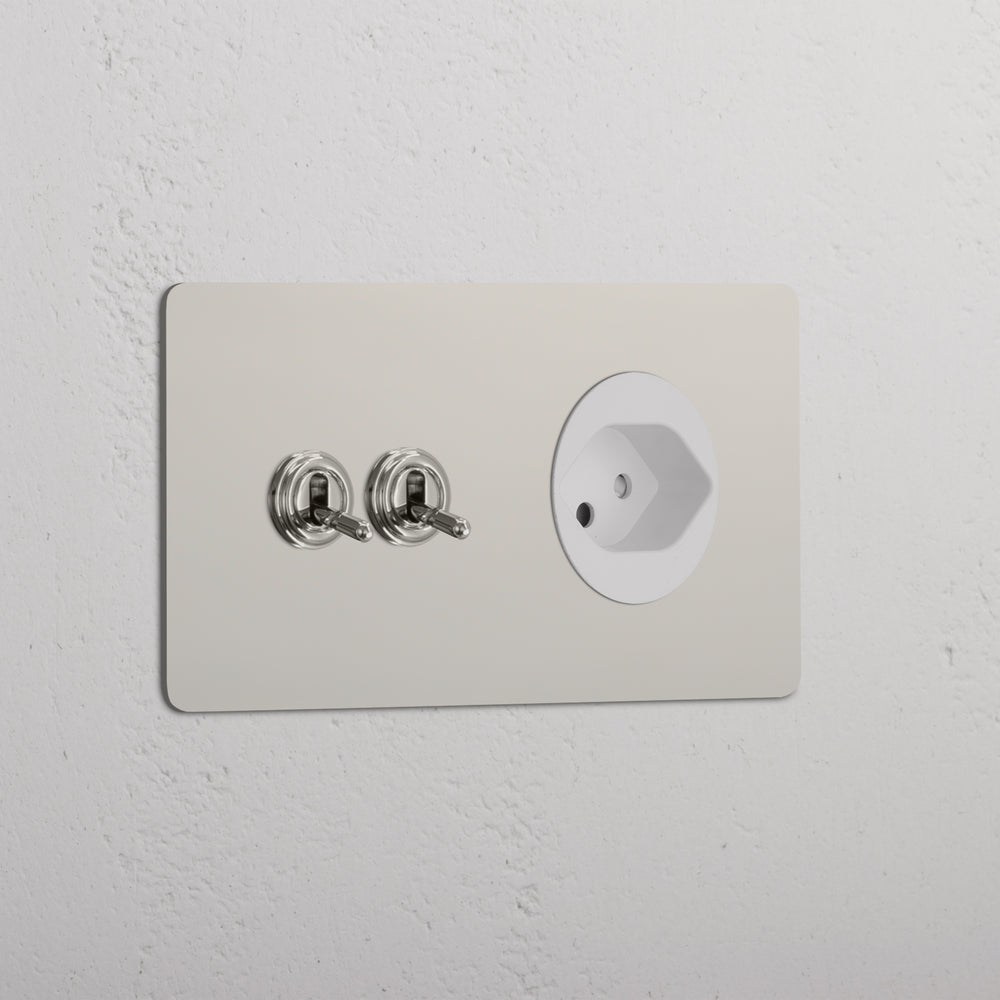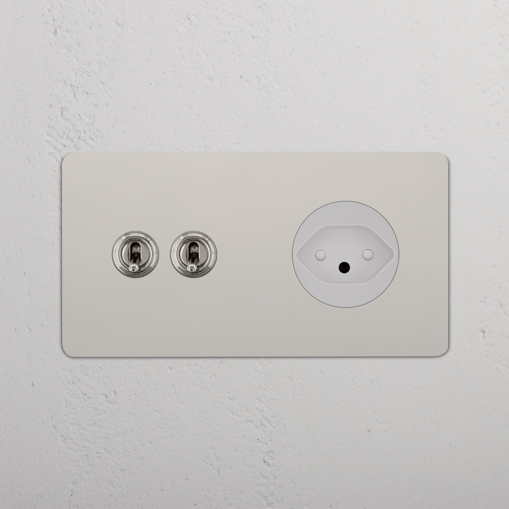 This double mixed switch and socket combines two two-way toggle switches and a Swiss socket on one plate.