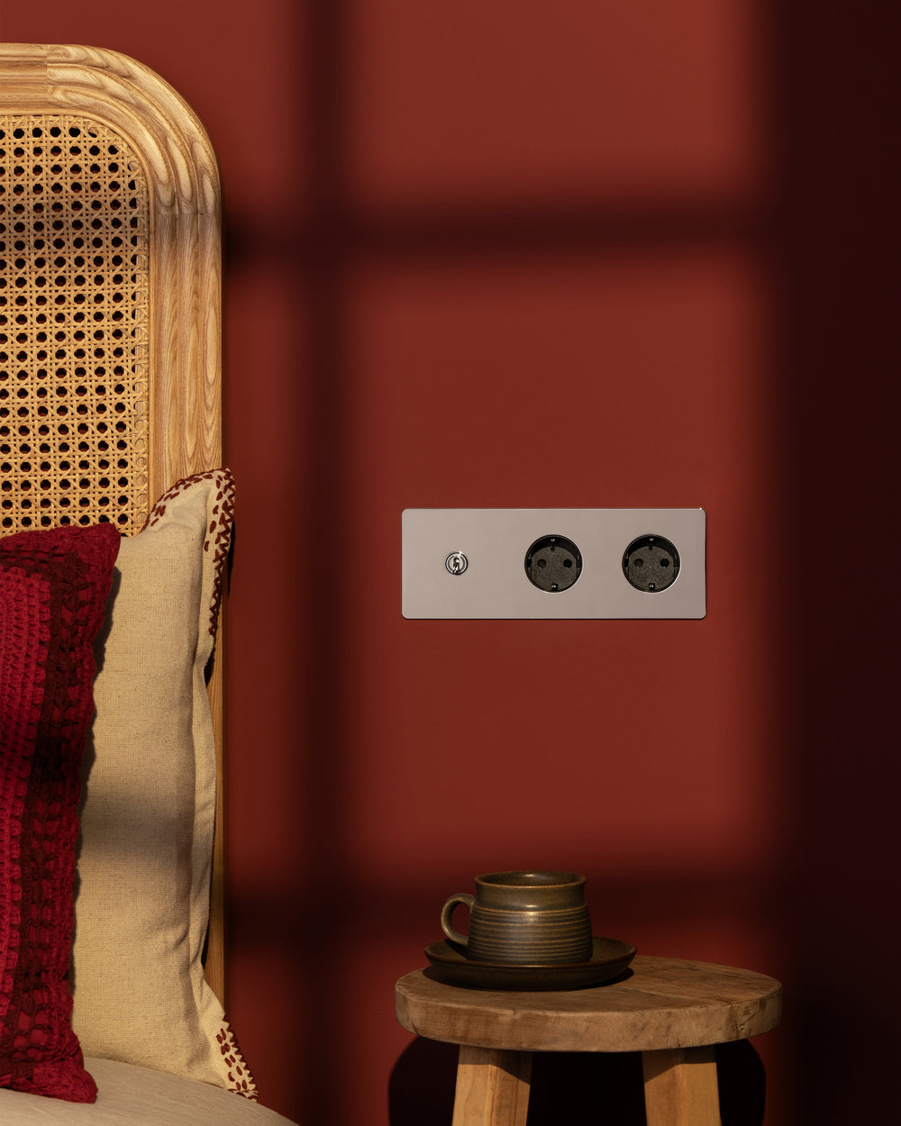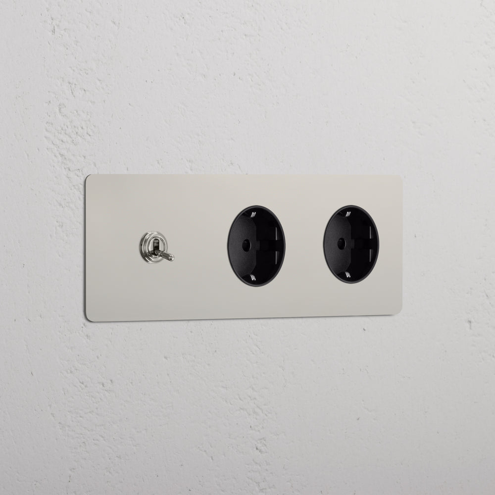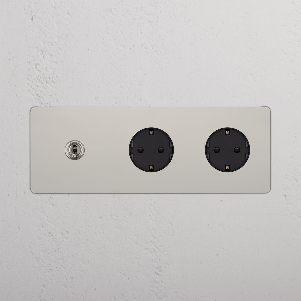 This triple mixed switch and socket combines a two-way toggle switch and two Schuko sockets on one plate.