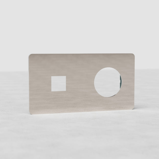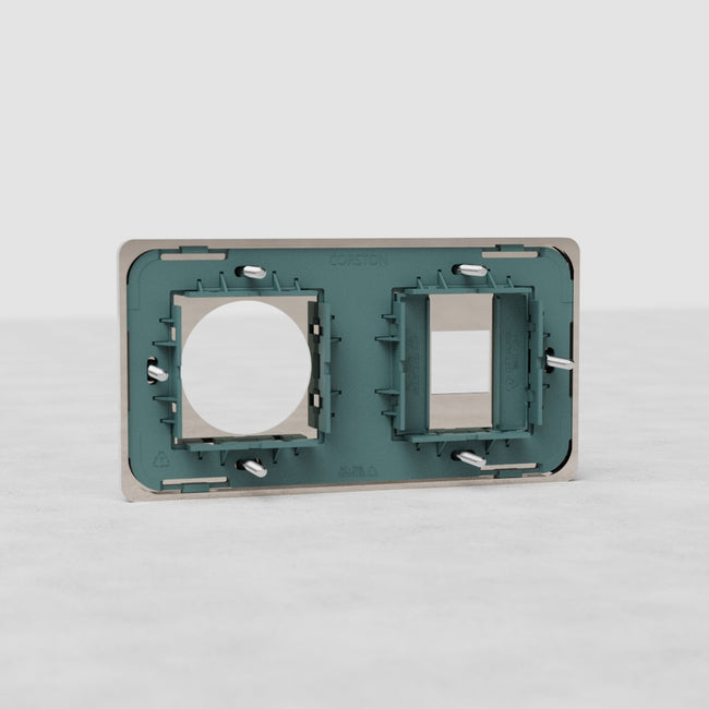 This Grove double 1x keystone and 1x socket plate in polished nickel works with any one of our 20mm keystone modules and any one of our round socket modules.