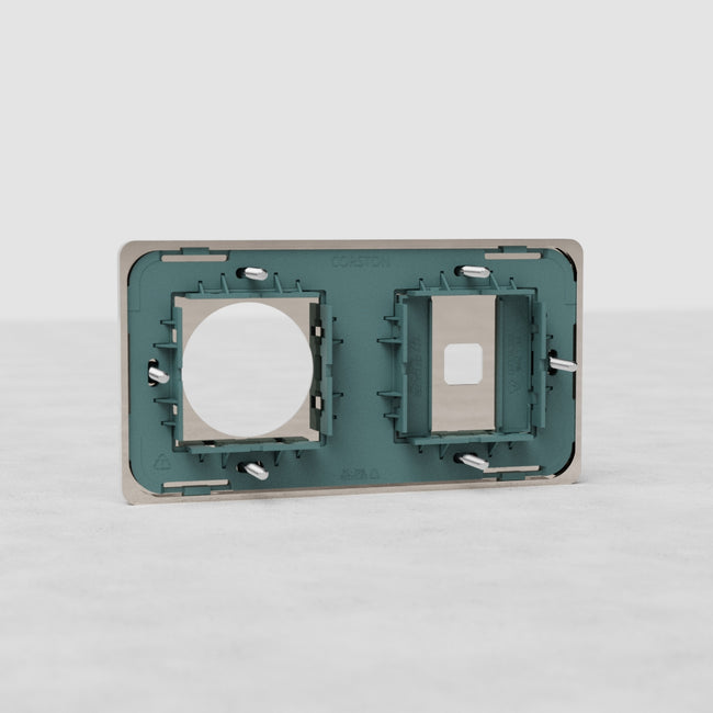 This Grove double 1x switch and 1x socket plate in polished nickel works with any one of our polished nickel toggle or rotary dimmer switches and any one of our round socket modules.