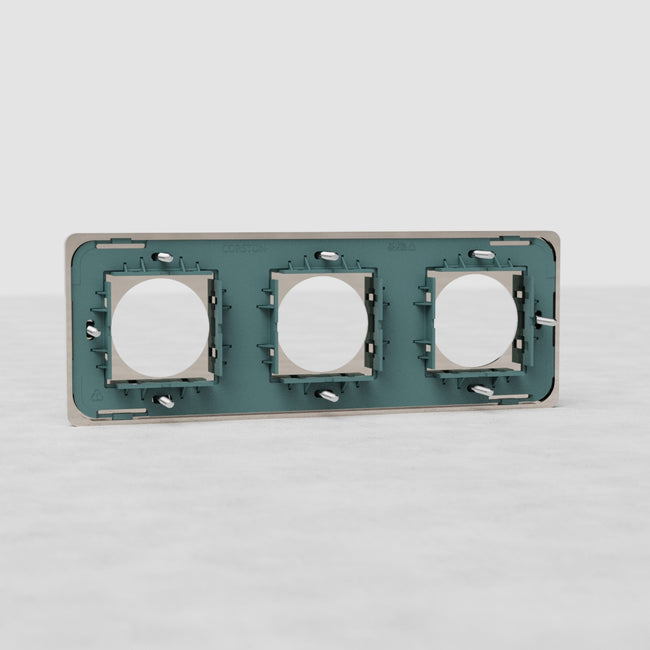 This Grove triple socket plate in polished nickel works with any three of our round socket modules.
