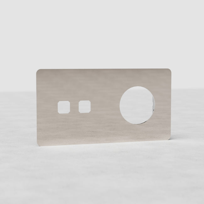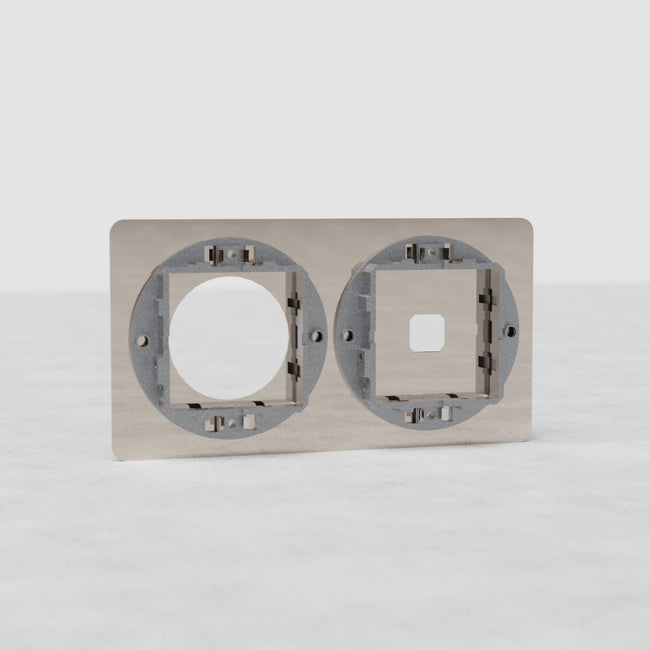 This Kew double 2x switch and 1x socket plate in polished nickel works with any two of our polished nickel toggle switches and any one of our round socket modules.