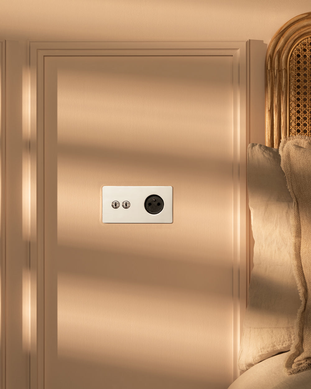 This double mixed switch and socket combines two two-way toggle switches and a French/Belgian socket on one plate.