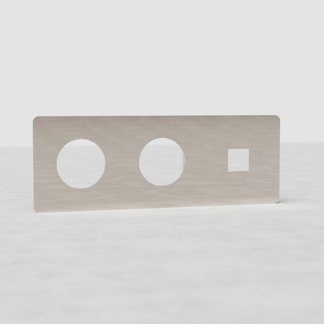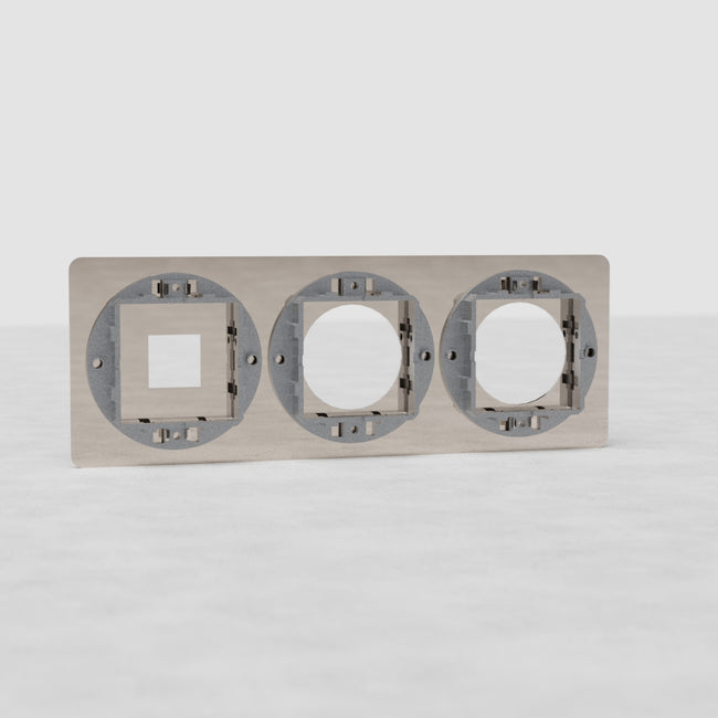 This Kew triple 1x keystone and 2x socket plate in polished nickel works with any one of our 20mm keystone modules and any two of our round socket modules.