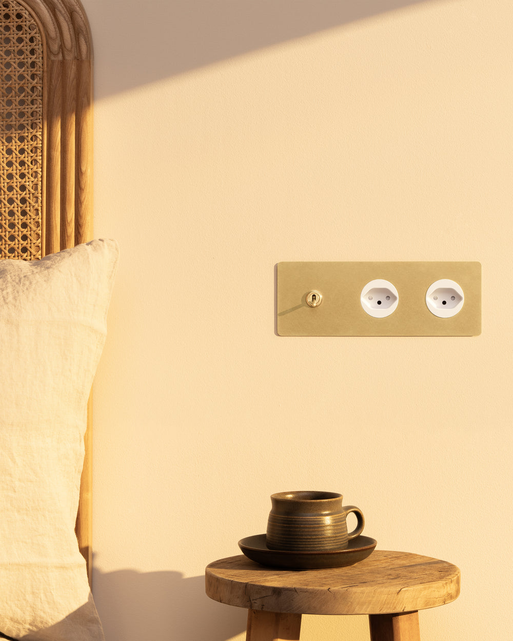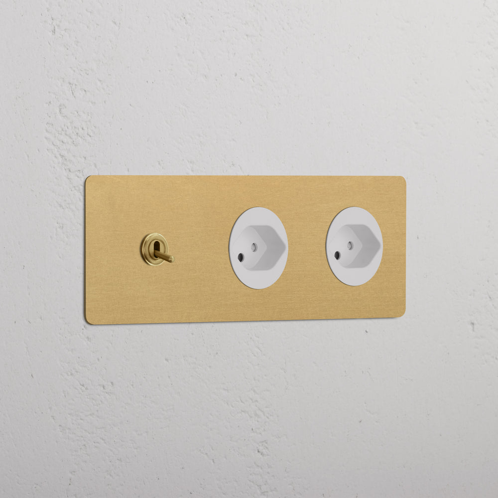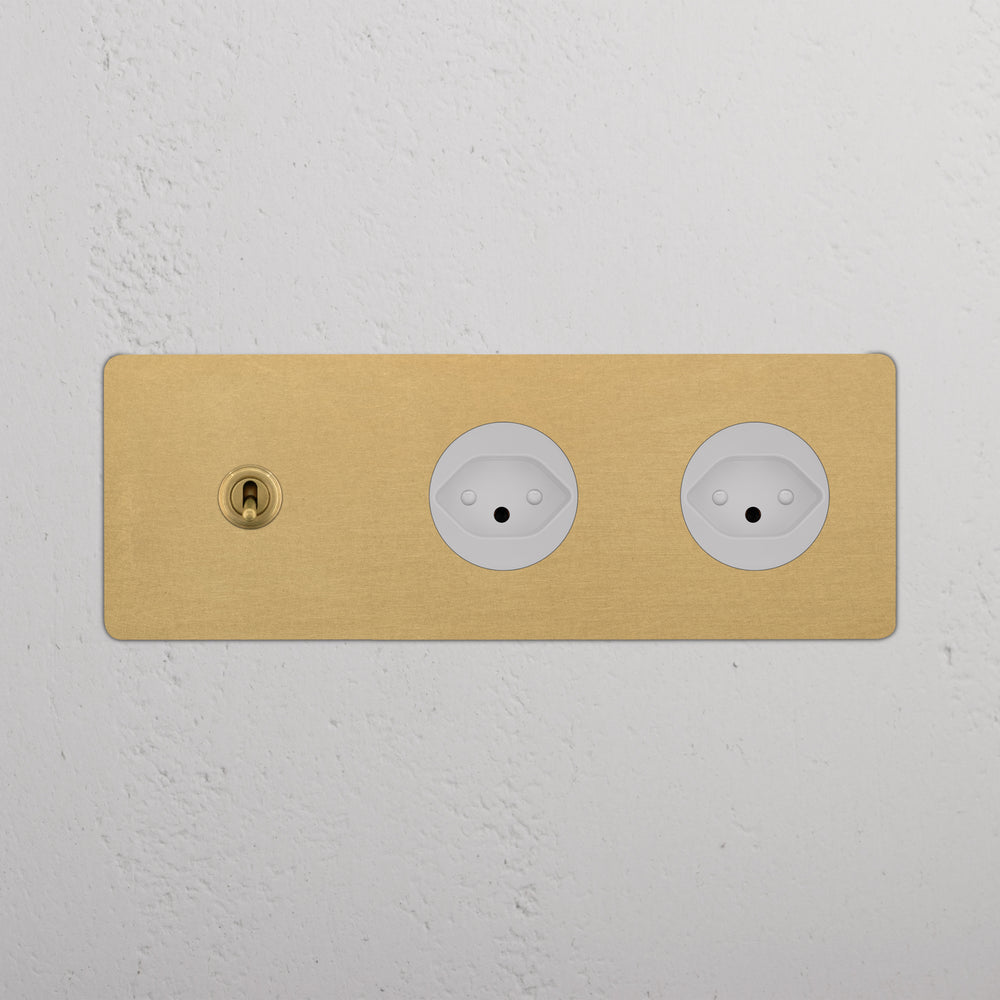 This triple mixed switch and socket combines a two-way toggle switch and two Swiss sockets on one plate.
