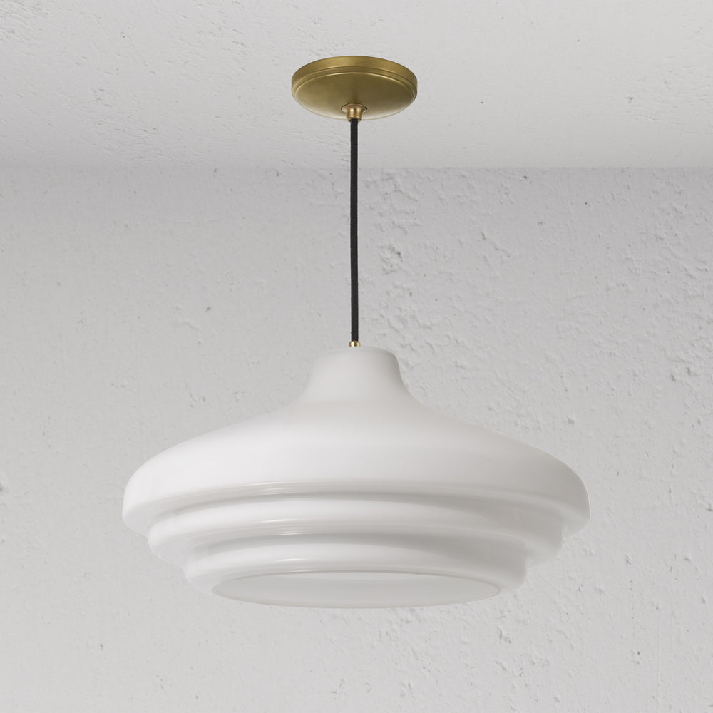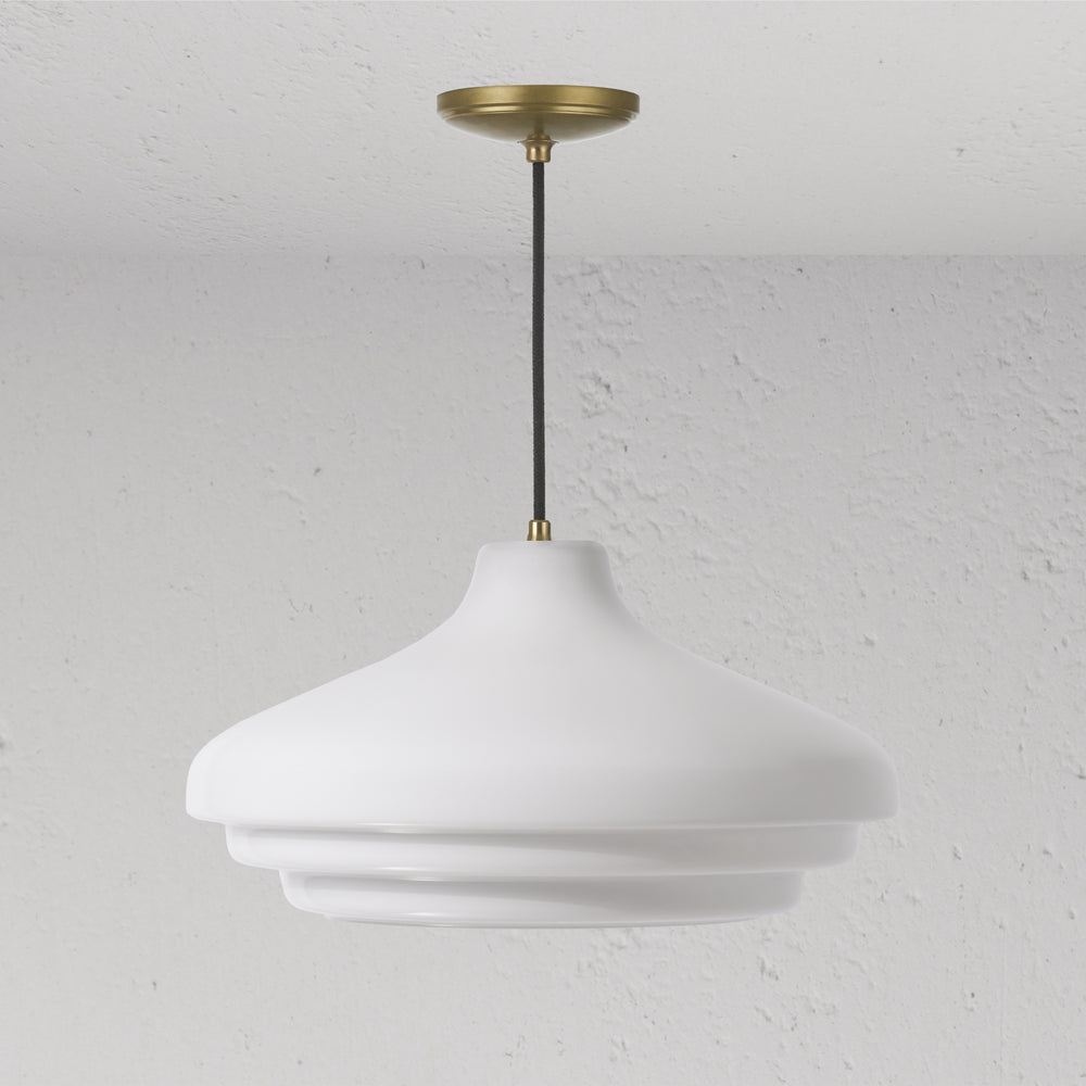 Our Brookfield pendant has an elegantly curved, three-tiered shade and a solid brass bulb holder. It’ll make a subtle statement without outshining other design features in your space.