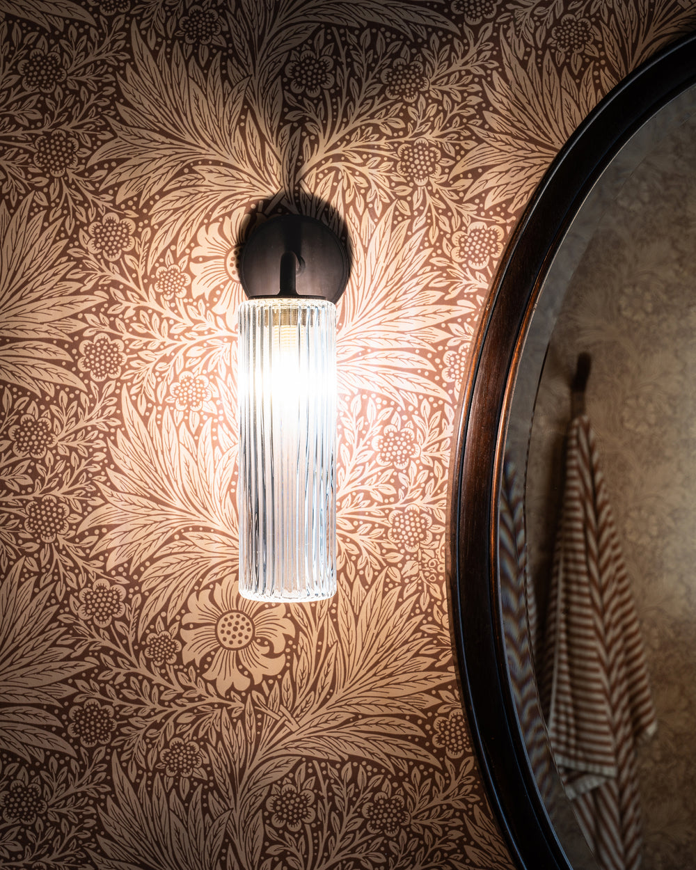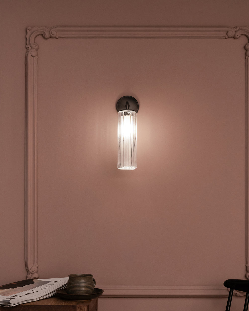 Bronze is our boldest finish, but it isn’t shiny or bright, so it has a subtle side to it too. It’s a deep matt brown colour that’s almost black in some lights. This fluted glass shade creates a defused, anti-glare light that looks timeless on your walls.
