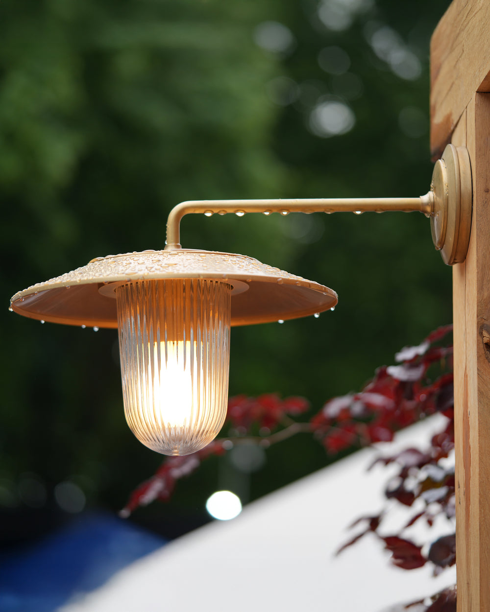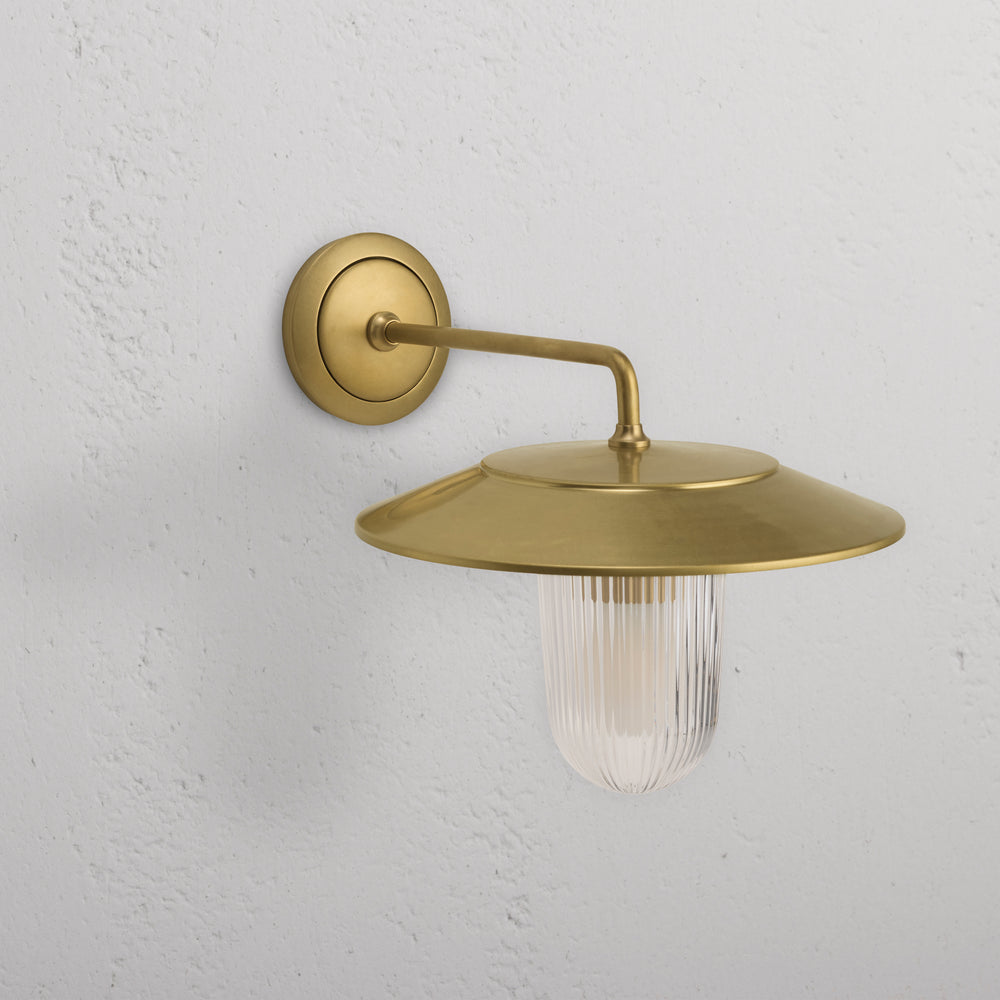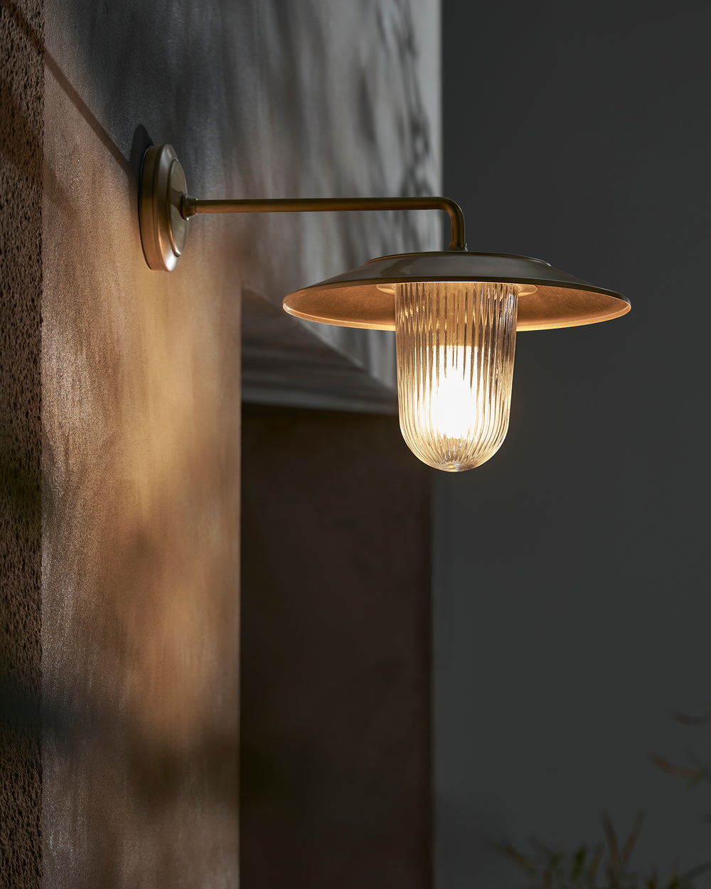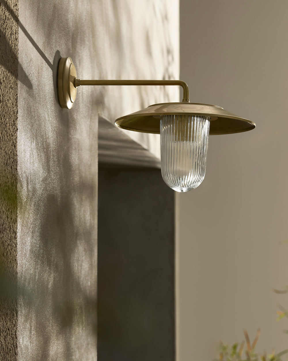 Our Kensington wall light has a large solid brass ‘cap’ to protect it from rain. The fluted glass cover provides 360-degree diffused lighting thanks to the vertical grooves.
