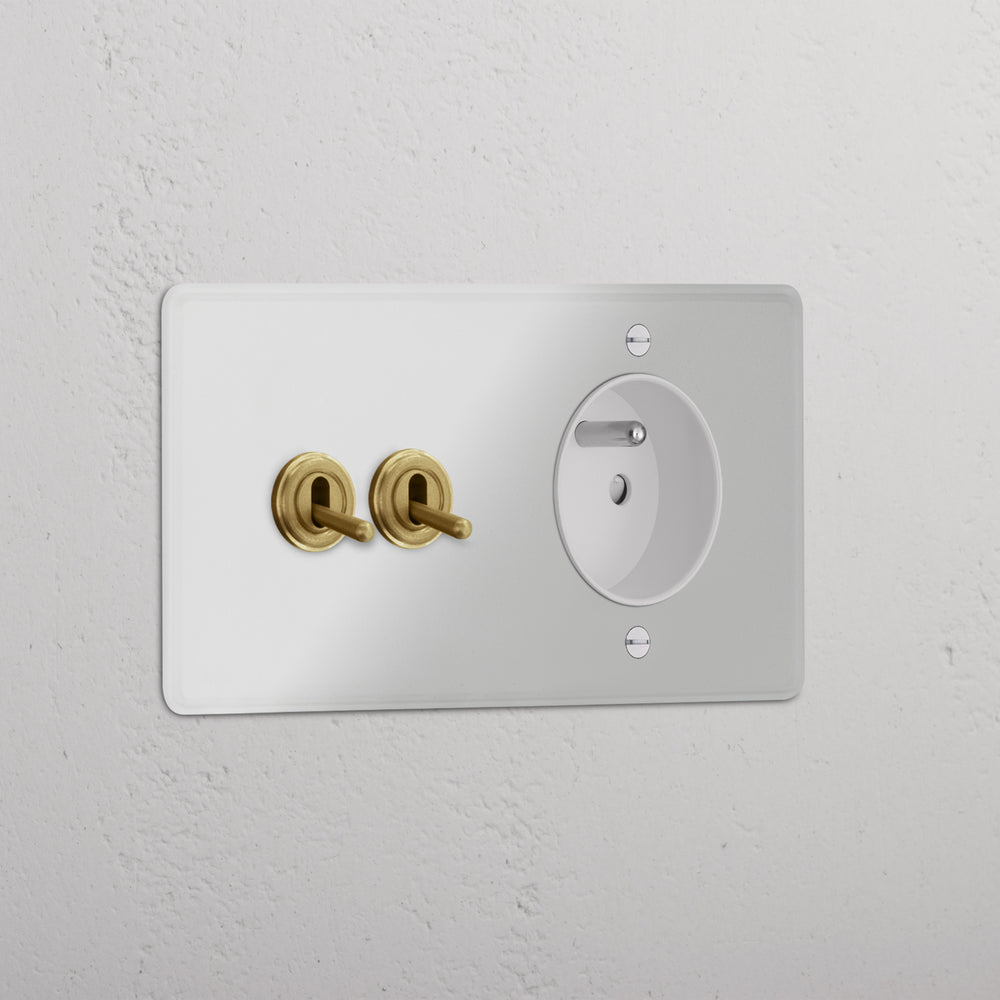 This double mixed switch and socket combines two two-way toggle switches and a French/Belgian socket on one plate.