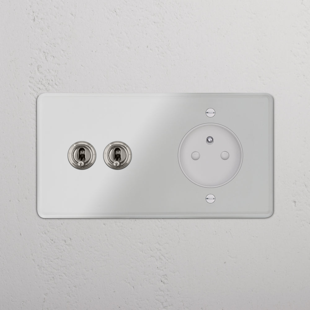 This double mixed switch and socket combines two two-way toggle switches and a French/Belgian socket on one plate.