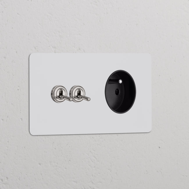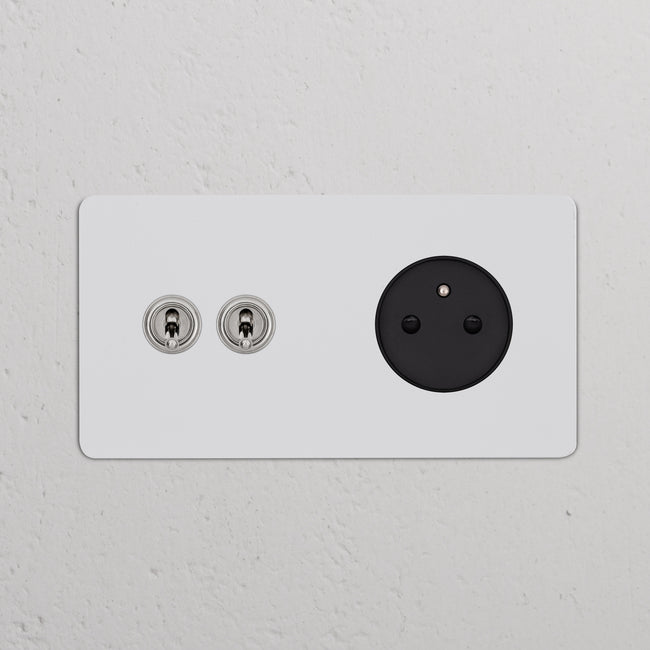 This double mixed switch and socket combines two two-way toggle switches and a French/Belgian socket on one plate.
