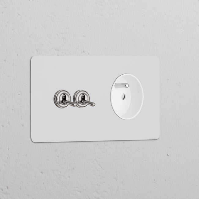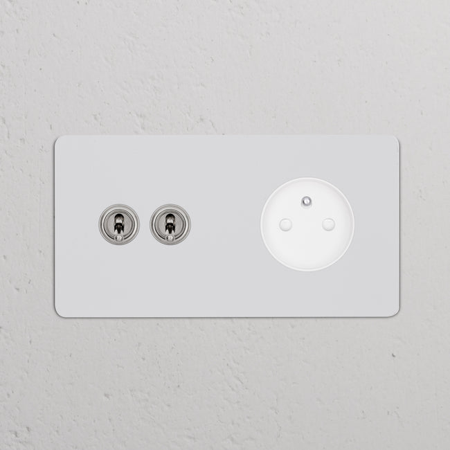This double mixed switch and socket combines two two-way toggle switches and a French/Belgian socket on one plate.