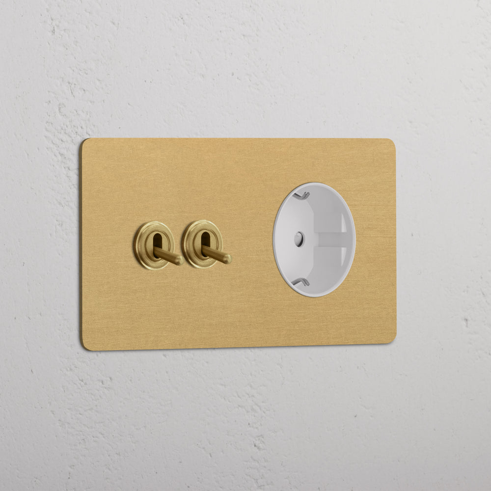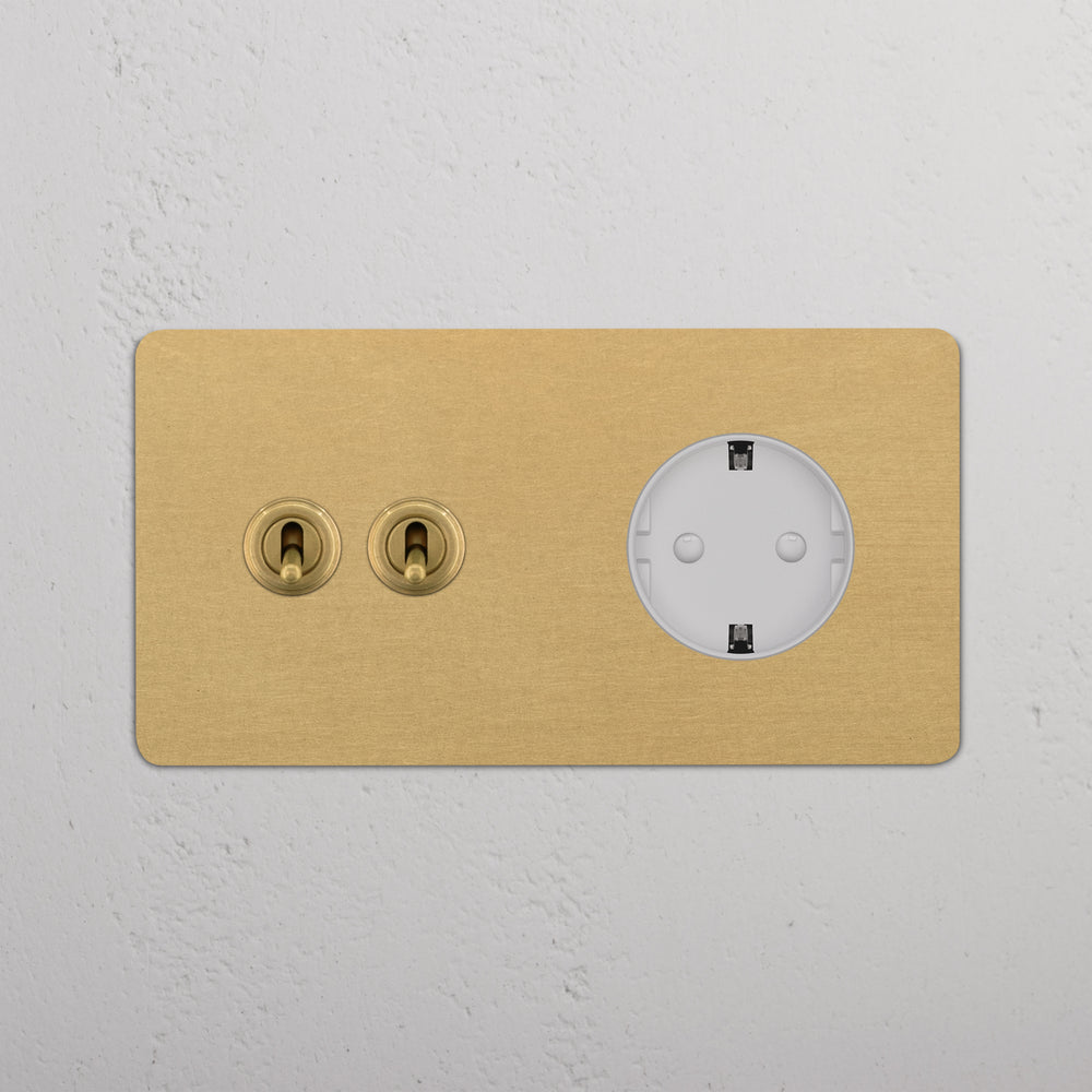 This double mixed switch and socket combines two two-way toggle switches and a Schuko socket on one plate.