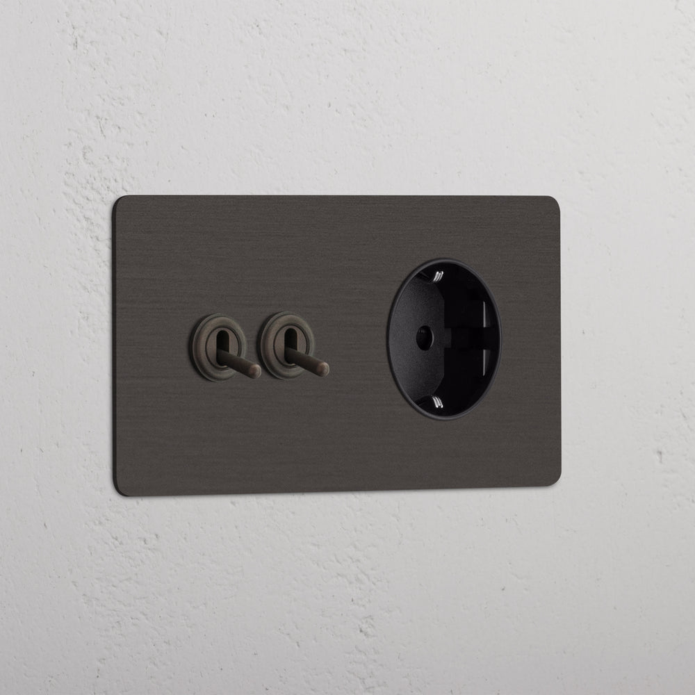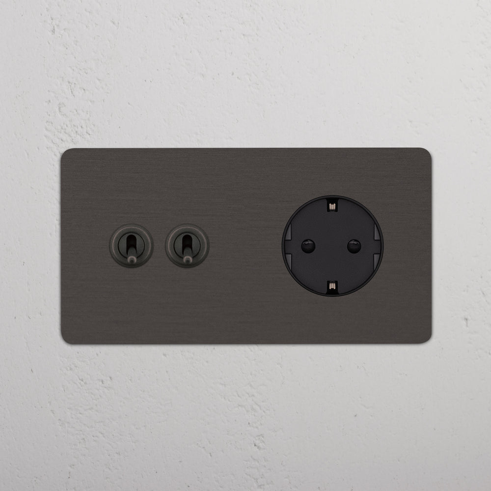 This double mixed switch and socket combines two two-way toggle switches and a Schuko socket on one plate.