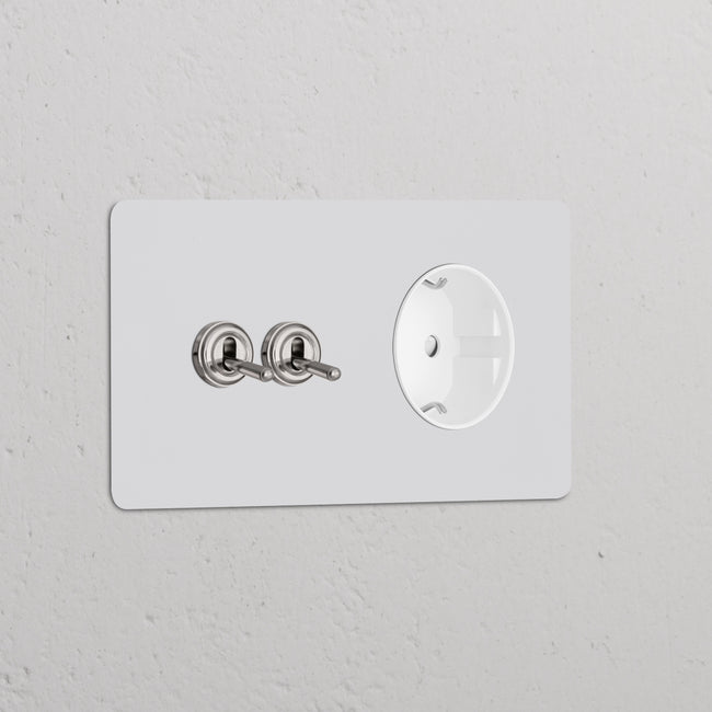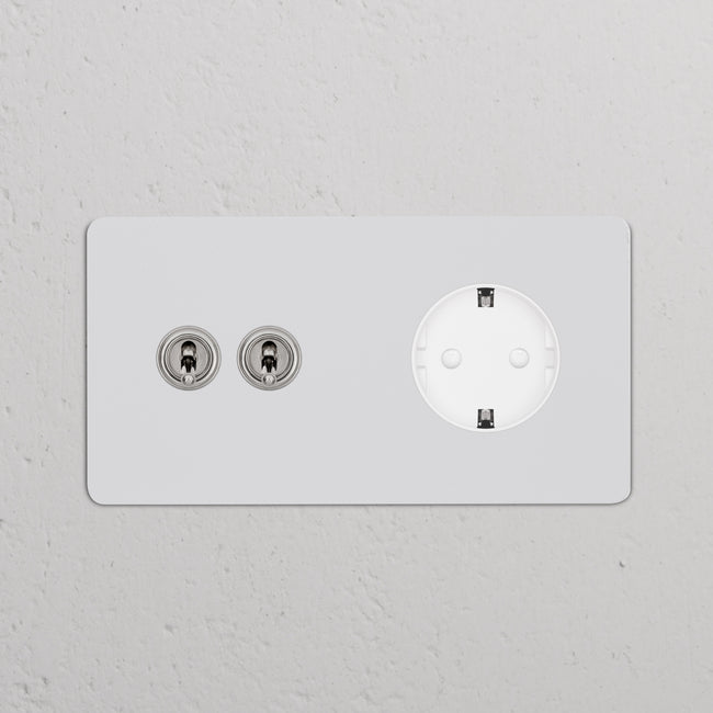 This double mixed switch and socket combines two two-way toggle switches and a Schuko socket on one plate.