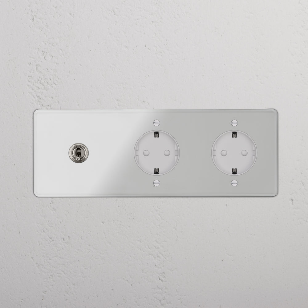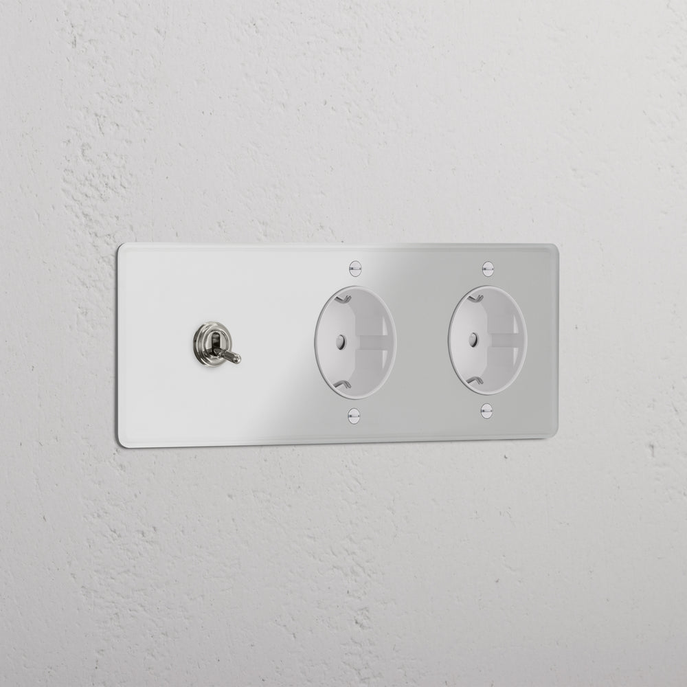 This triple mixed switch and socket combines a two-way toggle switch and two Schuko sockets on one plate.