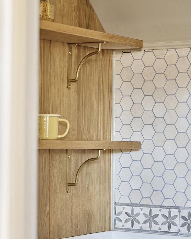 Our gently curved Kilburn shelf bracket is made from sturdy solid brass and will comfortably hold 40kg.