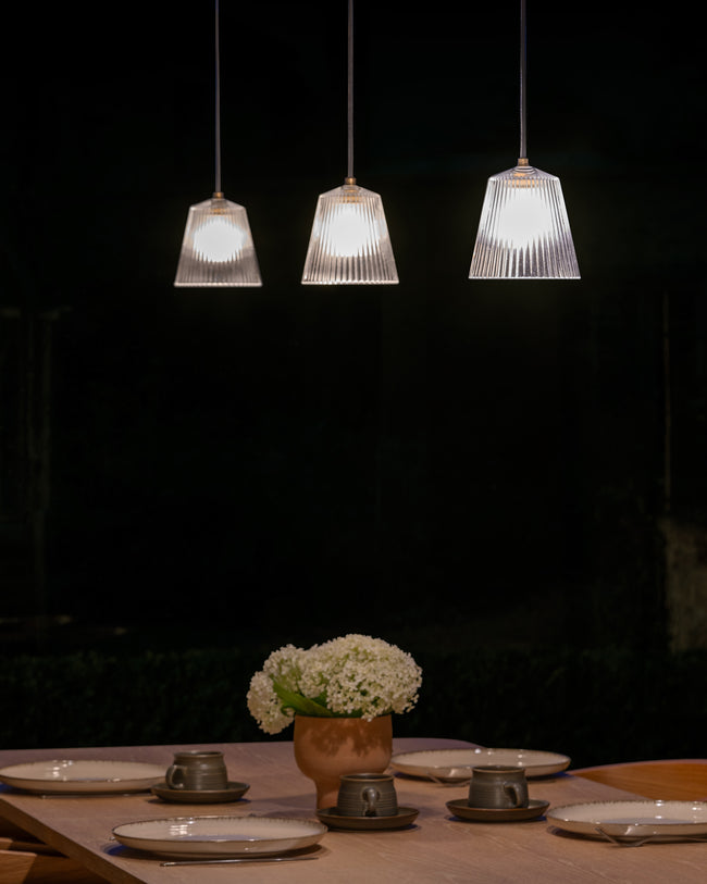 The fluted glass shade allows for 360-degree diffused lighting.