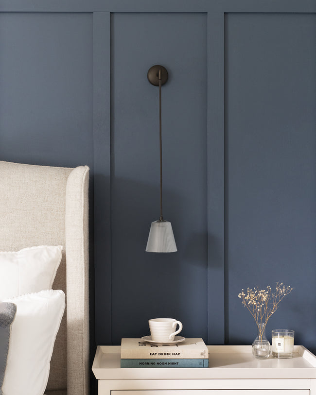 Bronze is our boldest finish, but it isn’t shiny or bright, so it has a subtle side to it too. It’s a deep matt brown colour that’s almost black in some lights. The fluted glass shade allows for 360 degree lighting and creates a timeless feel.