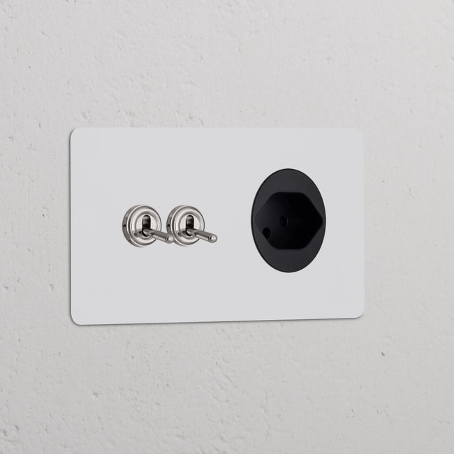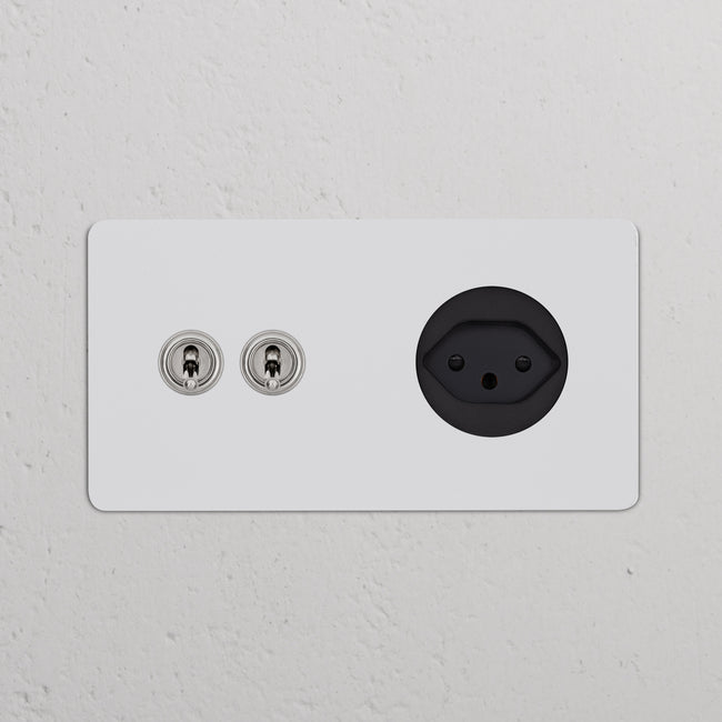 This double mixed switch and socket combines two two-way toggle switches and a Swiss socket on one plate.