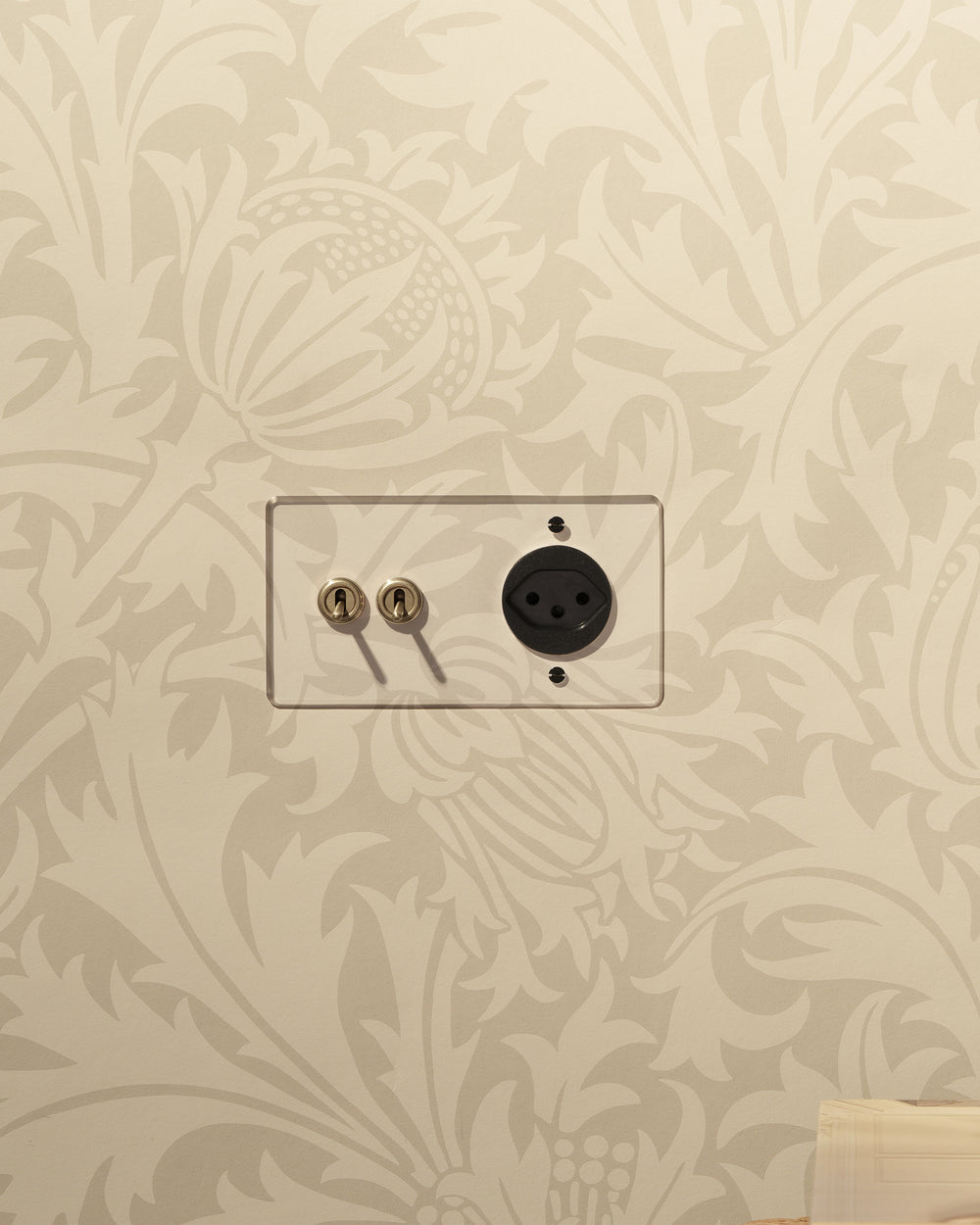 This double mixed switch and socket combines two two-way toggle switches and a Swiss socket on one plate.