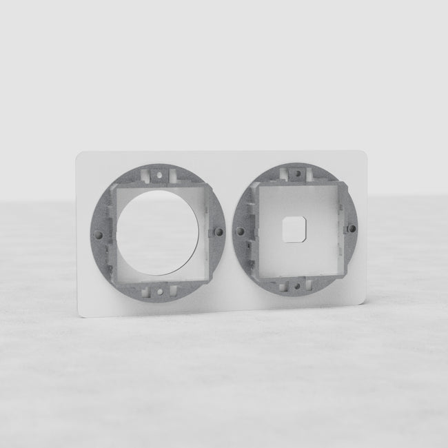 This Kew clear double 1x switch and 1x socket plate works with any one of our toggle or rotary dimmer switches and any one of our round socket modules (just make sure you choose the ones made with white plastic).