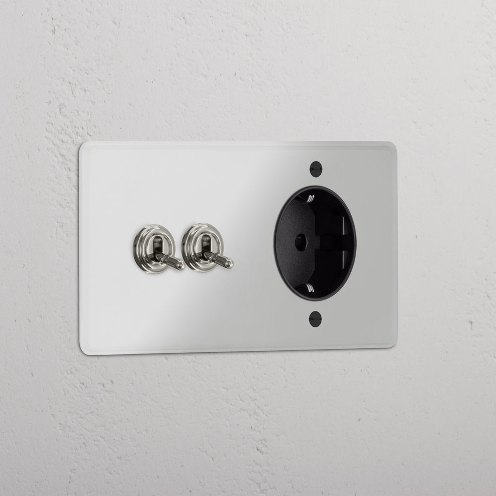 This double mixed switch and socket combines two two-way toggle switches and a Schuko socket on one plate.