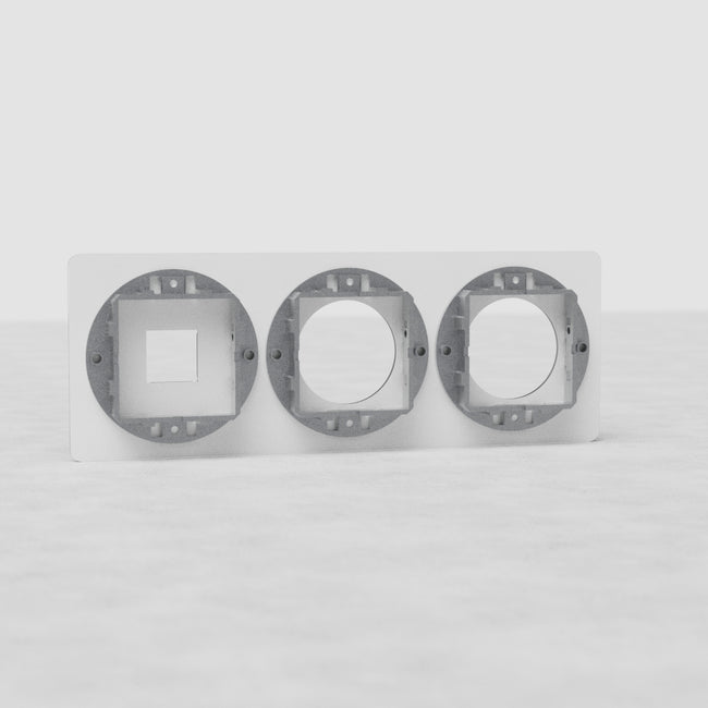 This Kew clear triple 1x keystone and 2x socket plate works with any one of our 20mm keystone modules and any two of our round socket modules (just make sure you choose the ones made with white plastic).