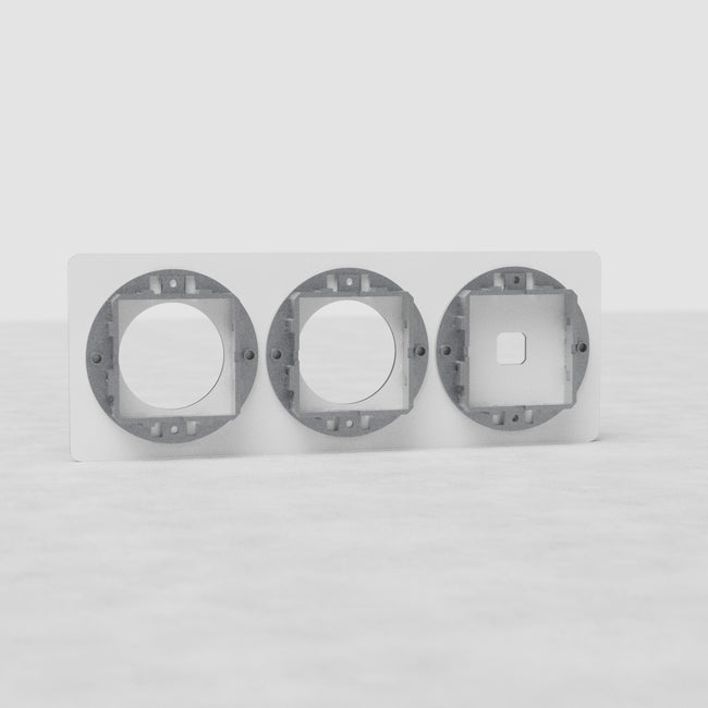 This Kew clear triple 1x switch and 2x socket plate works with any one of our toggle or rotary dimmer switches and any two of our round socket modules (just make sure you choose the ones made with white plastic).