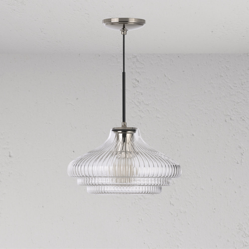 Our Brookfield pendant has an elegantly curved, three-tiered shade and a solid brass bulb holder. It’ll make a subtle statement without outshining other design features in your space.