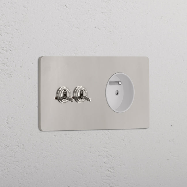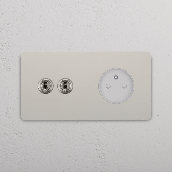 This double mixed switch and socket combines two two-way toggle switches and a French/Belgian socket on one plate.