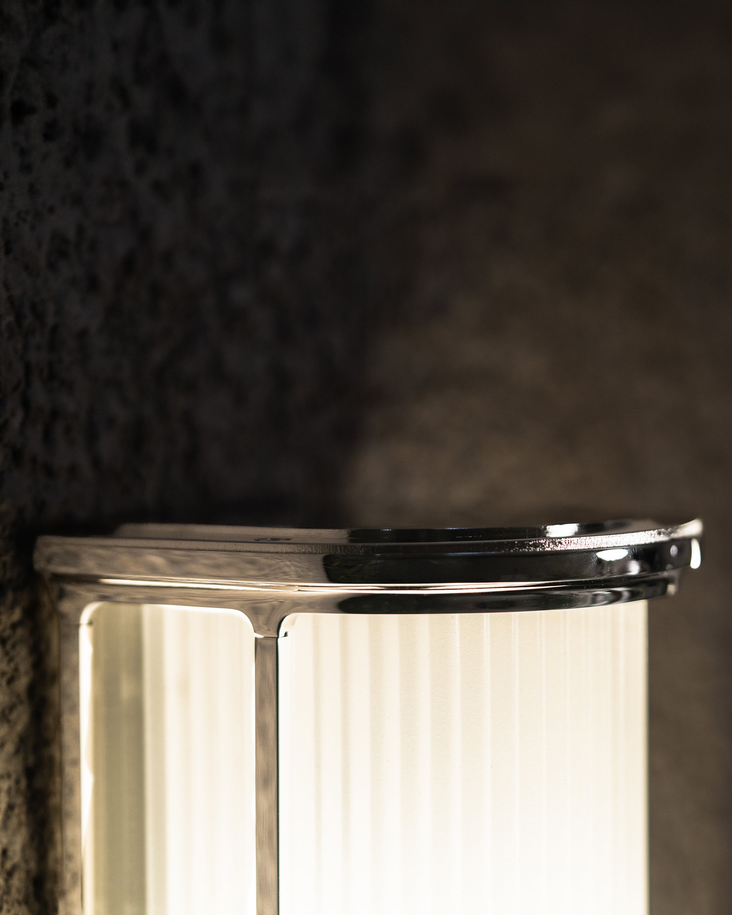 Bank is our take on a box light featuring a sturdy solid brass frame that holds a frosted fluted glass shade. The internal parts have been powder coated in white, so it looks great whether it’s switched on or off.