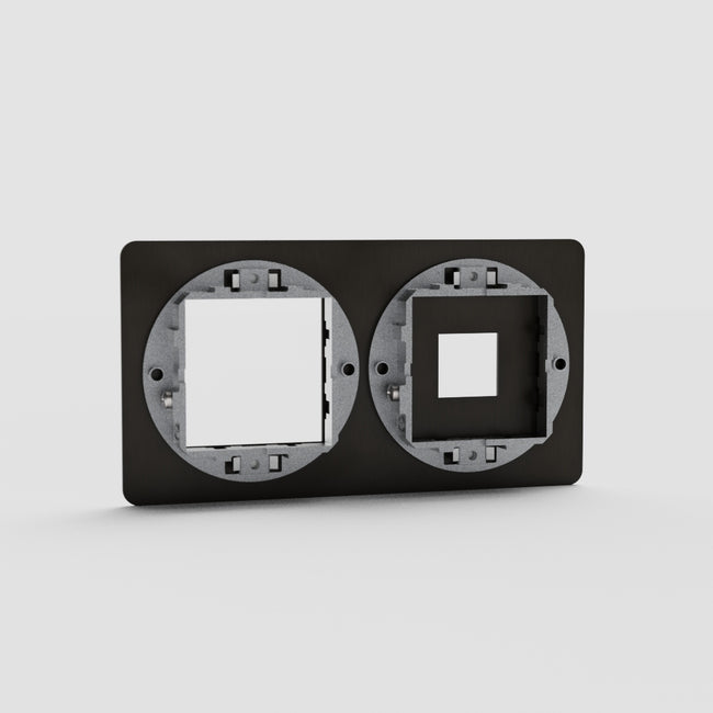This Kew double 1x keystone and 1x 45mm module plate in bronze works with any one of our 20mm keystone modules and any one of our bronze rocker switches or our 45mm socket modules (just make sure you choose the ones made with black plastic).