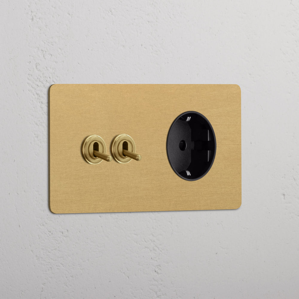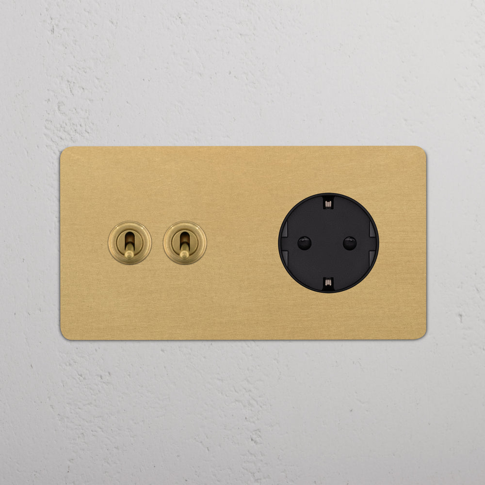 This double mixed switch and socket combines two two-way toggle switches and a Schuko socket on one plate.
